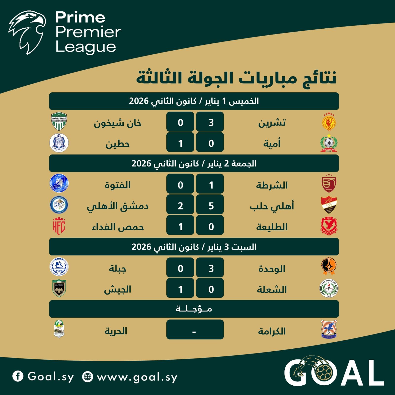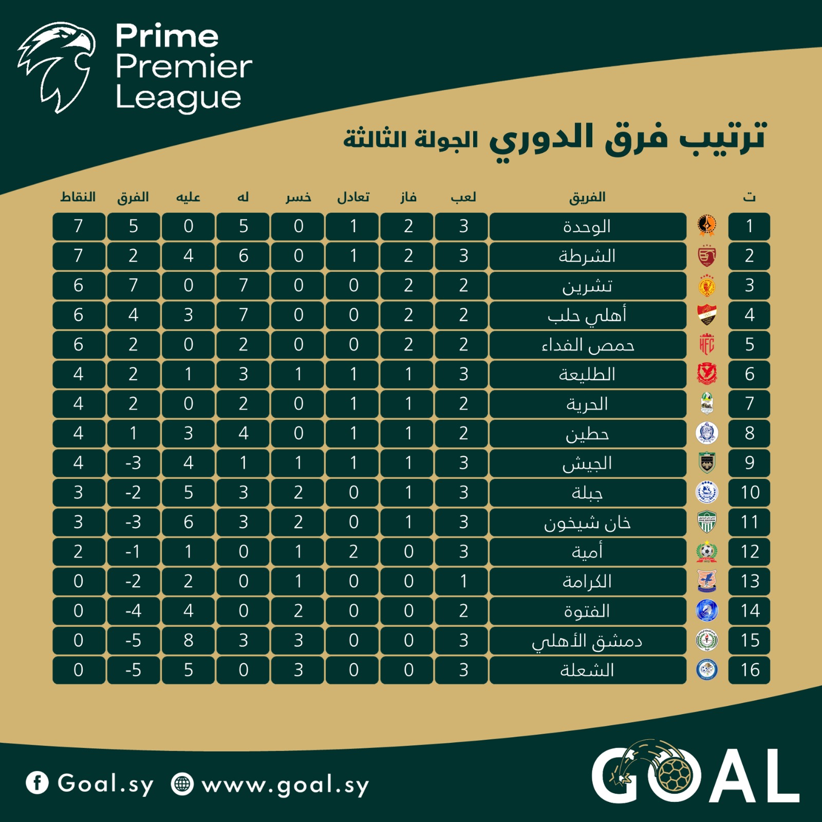 شهدت الجولة الثالثة من دوري "برايم" للمحترفين إثارة كبيرة ونتائج لافتة، حيث حضرت الأهداف بغزارة في بعض الملاعب، بينما حسمت "النتائج الضيقة" مواجهات أخرى، وسط تألق لافت لأندية العاصمة وحلب والساحل.